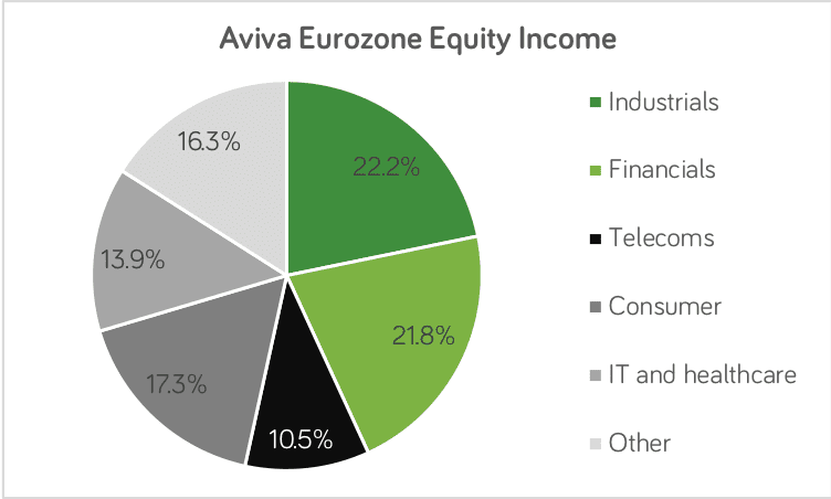 Aviva Eurozone Equity Income Fund offers access to this opportunity. The fund is spread well amongst industries, as the chart below shows.